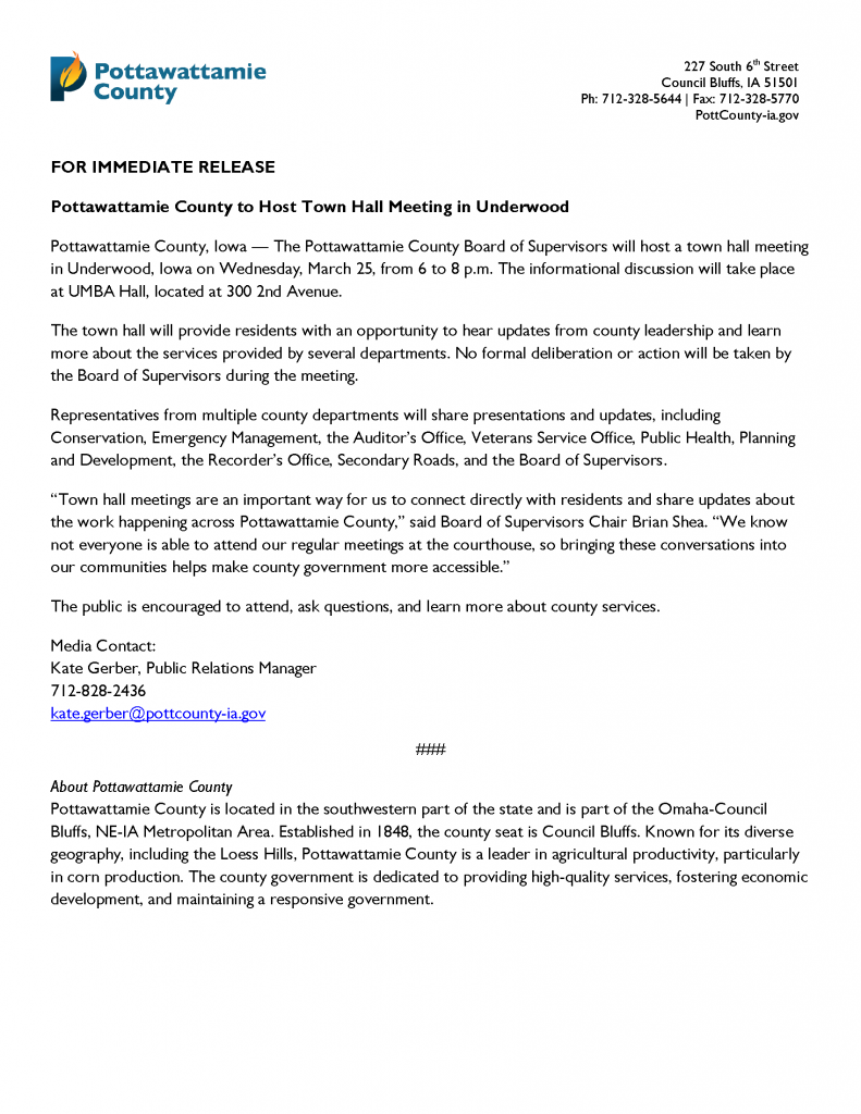 Pottawattamie County Underwood Town Hall Press Release Published March 5, 2026 at 1700 × 2200 in Home